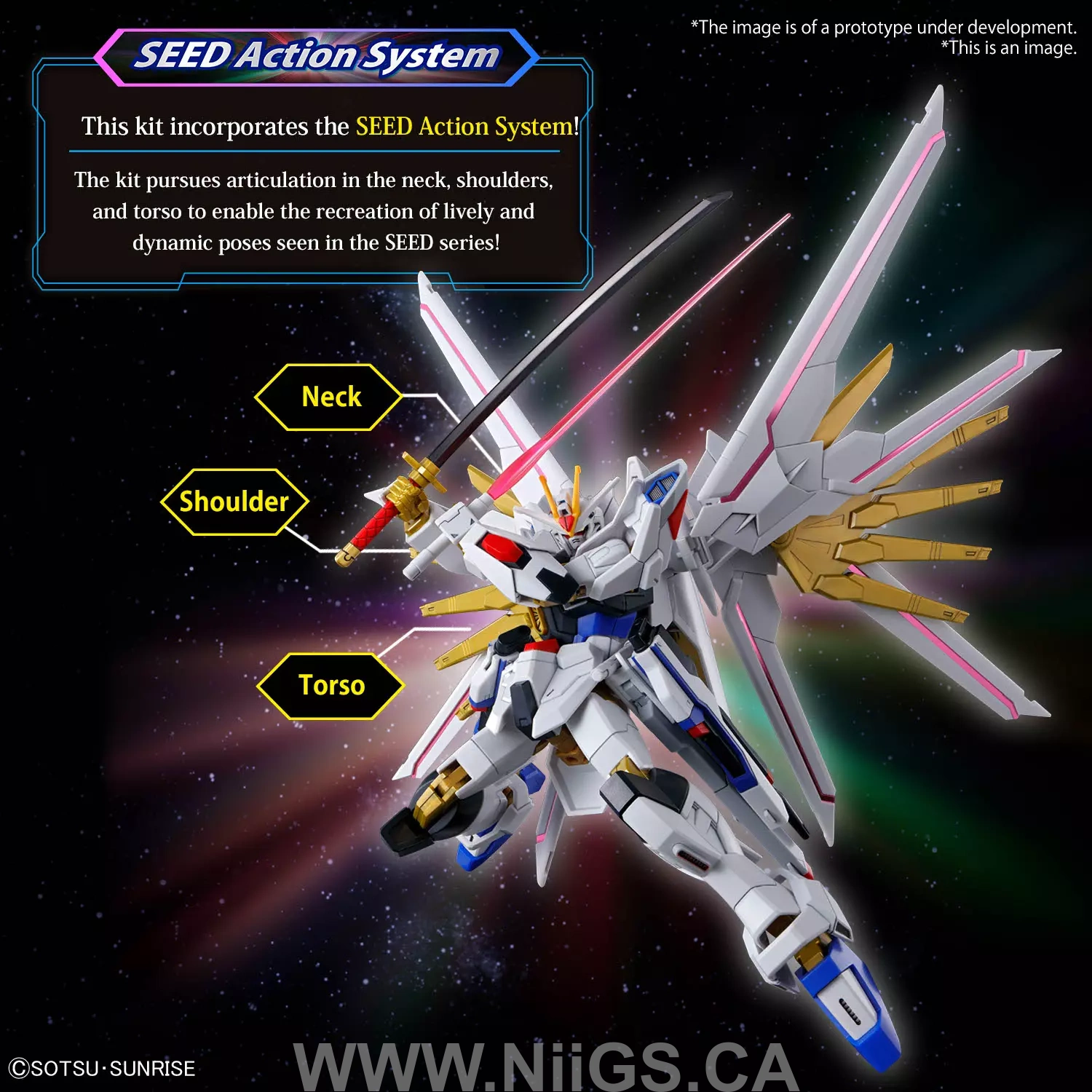 ■ウイング部分は個別で広範囲に可動。さらに白のウイングは8か所がスライド可動し展開状態を再現可能。発光表現には3Dメタリックシールを採用。