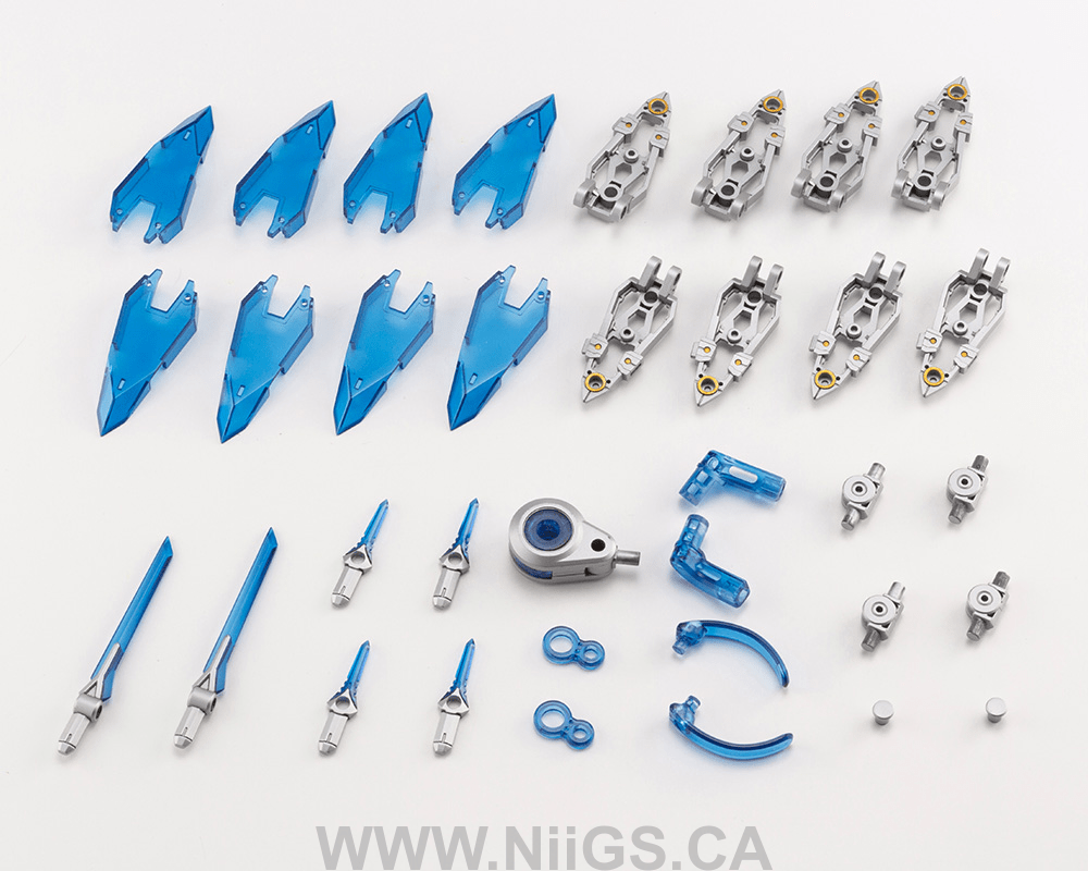 The armor parts are clear blue, and the internal mecha frame is silver. The clear color of the armor gives users a glimpse of the silver frame inside for a beautiful finish on this Heavy Weapon Unit.
