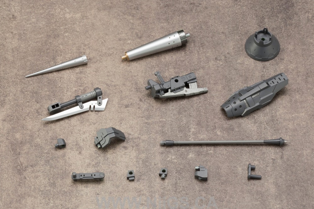 Based on the Lance/Double Blade that is no longer in production, this oversized lance comes with two interchangeable tips. The conical lance tip is made of silver plastic, giving it a striking appearance even without paint or decals. The weapon grip has improved stability when held by models as well as a movable feature, giving it a wide range of utility. The shield on the side of the weapon can also be detached.