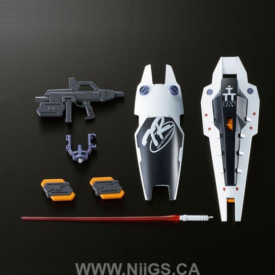 All of the exterior armor is reproduced with new molding, along with Auxiliary Actuator Unit, strengthened leg parts, a mobile Booster Pod, Backpack, Shield Booster, Beam Rifle, and Shield!