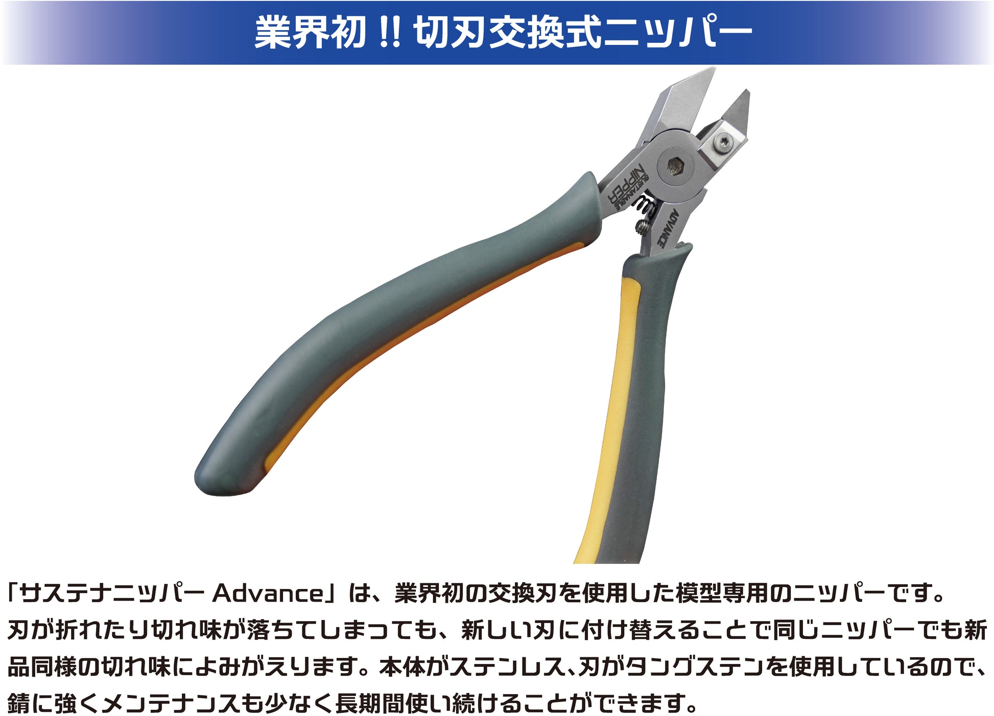 A single-edged nipper with replaceable blade The "Sustainable Nipper Advance" is a modeling-exclusive nipper that utilizes a replaceable blade, a first in the industry. Even if the blade breaks or loses its sharpness, you can bring it back to its brand-new cutting performance by replacing it with a new blade. The body is made of stainless steel, and the blade is made of tungsten, making it resistant to rust and requiring minimal maintenance for long-term use.