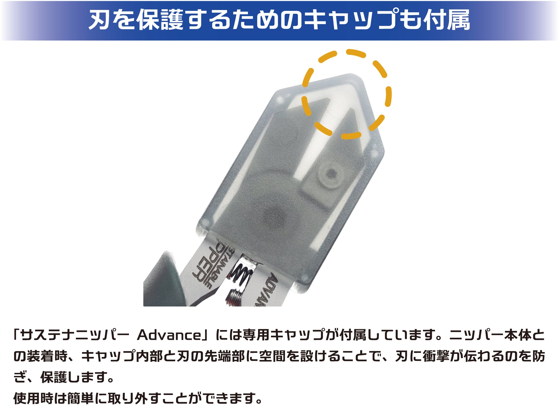 The "Sustainable Nipper Advance" comes with a dedicated cap. When attached to the nipper body, it creates space between the cap and the tip of the blade, preventing impact transmission and providing protection. It can be easily removed during use.