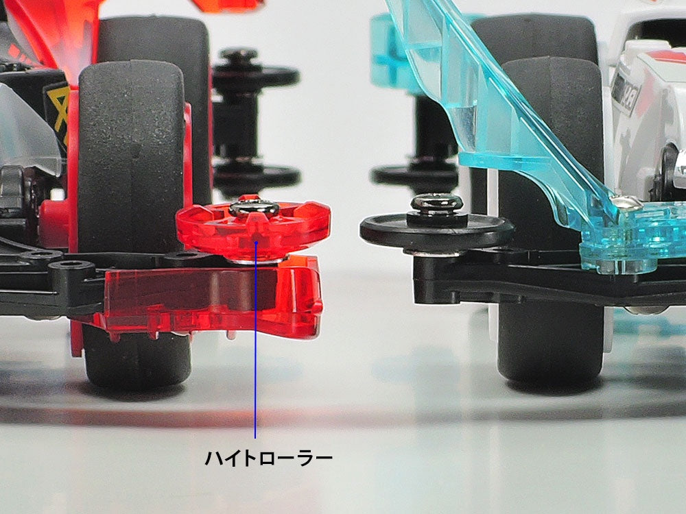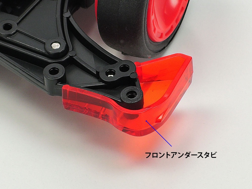 The Jadow A is a mini 4WD driven by Endo Jin, one of the rivals in the manga "Mini 4 King," currently serialized in CoroCoro Comic. Its edgy and combative form is fully reproduced, down to the hot red colors of the special parts that improve its driving performance. Three types of parts -- the rear high mount roller, the front under-stabilizer attached to the front bumper, and the height roller set 2mm higher than the normal roller -- provide it with outstanding stability. Its classic VZ chassis is lightweight and compact, suitable for battle on the track! Dish-type wheels equipped with large-diameter slick tires are coordinated in red to match the special parts, and metallic stickers are included too. Order yours today!