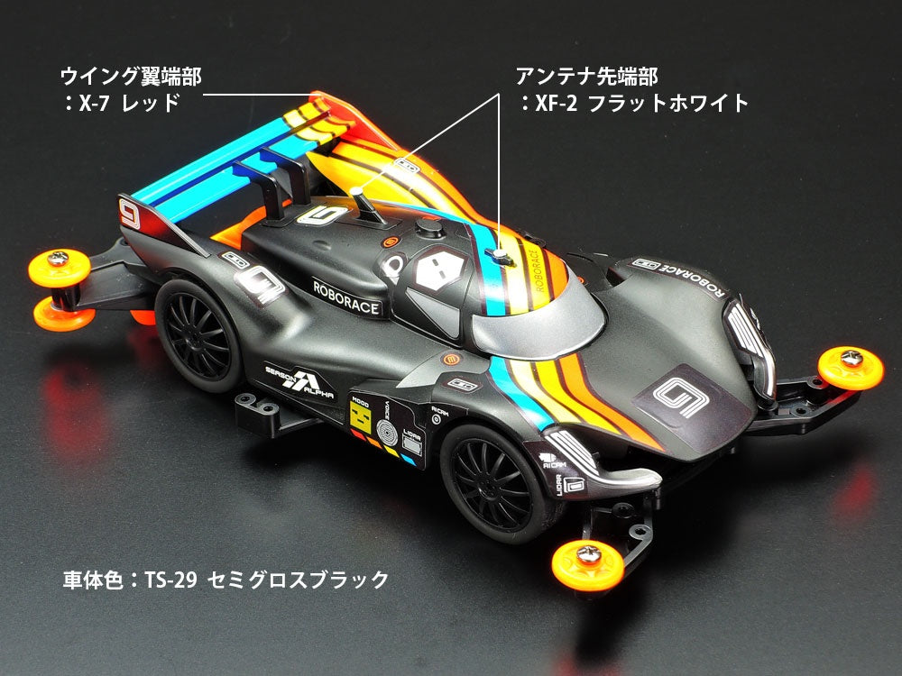 This assembly kit creates a Mini 4WD car version of the Roborace DevBot 2.0. The prototype race car makes for a stylish Mini 4WD subject, with the body molded accurately in black and based upon the high performance MA chassis. Stickers are included in the kit to recreate markings and even a choice of emoji for the Emotion System display. What are you waiting for? Get Roborace onto your Mini 4WD track!