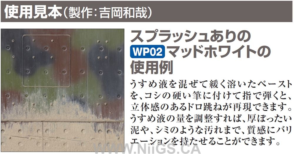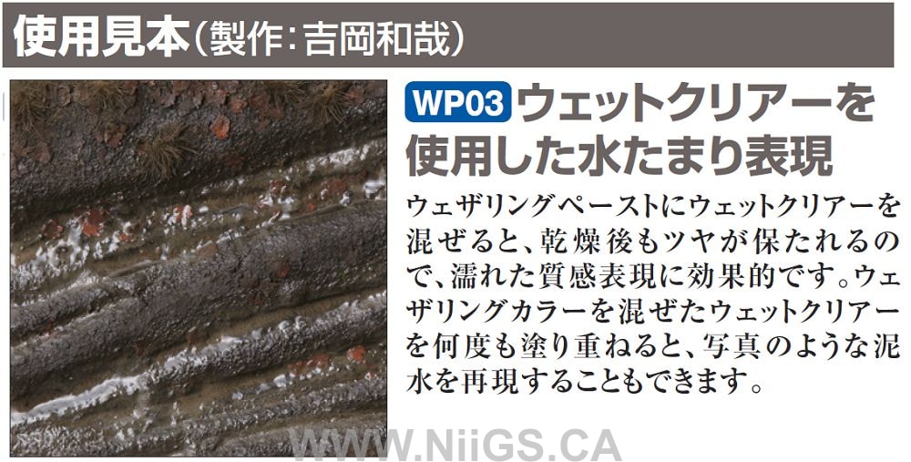 MR.WEATHERING PASTE is very thick, so it is most suitable for reproducing three dimensional stains such as mud. WP03 WET CLEAR can reproduce a moistened texture when it is mixed with other WEATHERING PASTE.When used on its own, you can create a puddle effect.